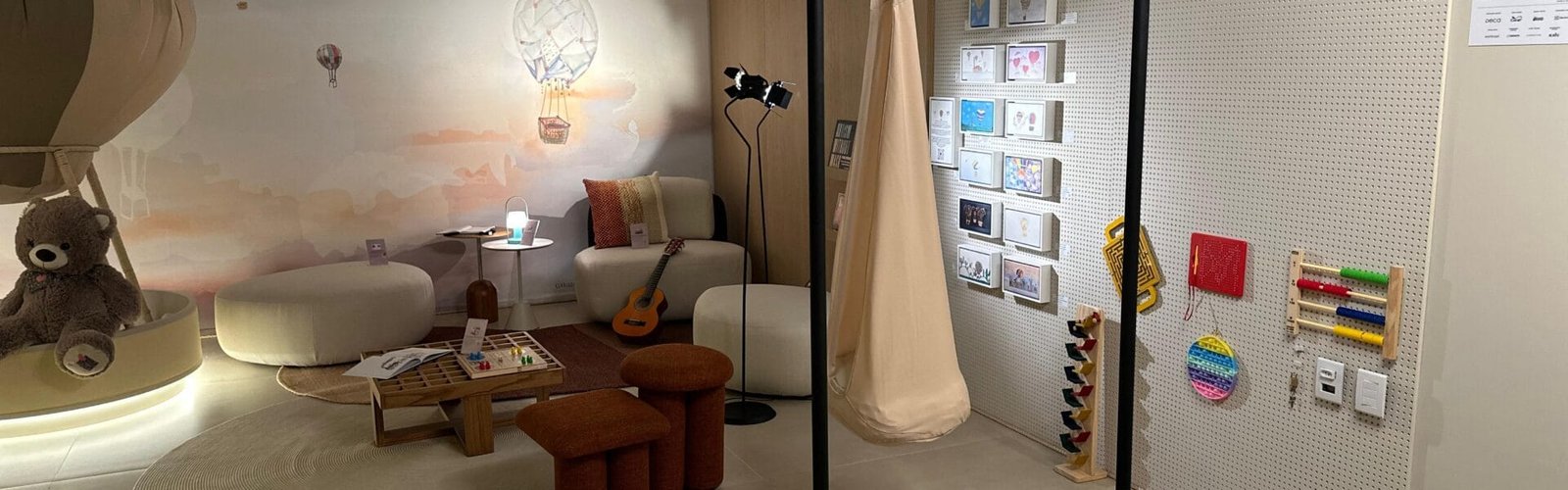 Com o objetivo de proporcionar uma experiência acolhedora e ao mesmo tempo lúdica, o Espaço Inclusivo, idealizado pelo escritório Motta Arquitetura, apresenta soluções criativas e terapêuticas: painel sensorial, piscina de bolinhas, mesa de estudos, balão gigante cenográfico e até uma pintura de céu, transportando Pedro para um universo que é só dele. A iluminação é majoritariamente indireta, pensada para respeitar a sensibilidade sensorial, enquanto as paletas em tons claros e sóbrios reforçam a sensação de calma e bem-estar.
