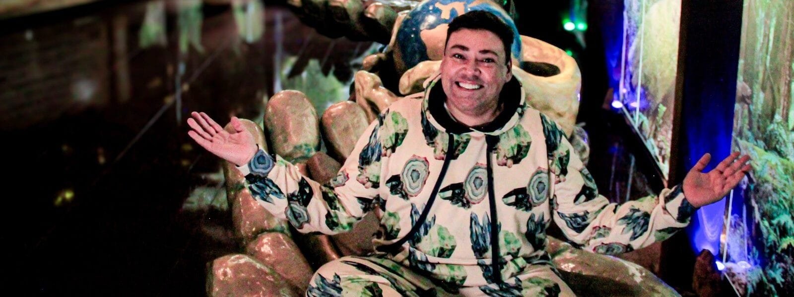 Para alinhar os chakras com a força dos cristais, o apresentador vestiu um look da nova coleção da marca Tjama chamada Quartzo. Ele explica que a coleção foi inspirada na beleza do universo mineral, destacando cristais em tons vibrantes de azul profundo, verde esmeralda e nuances terrosas. Os chakras são centros de energia vital do nosso corpo e desempenham um papel fundamental no equilíbrio físico, emocional, mental e energético.