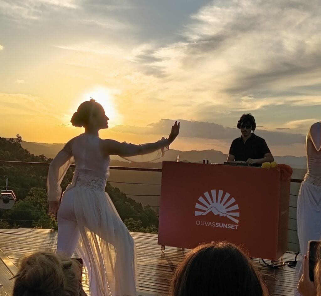 O encerramento aconteceu no Olivas de Gramado. Antes do pôr do sol, participamos de uma aula sobre azeite de oliva que foi didática e aprofundada, abordando produção e análise sensorial. Em seguida, um happy hour com petiscos e espumante marcou o brinde coletivo ao entardecer. Música e apresentação ao vivo acompanharam o momento enquanto o céu mudava de cor sobre o vale.