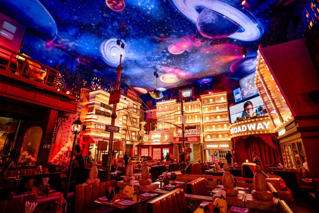 À noite, a experiência mudou de tom na Heróis da Pizza. Ambientada como uma Nova Iorque cenográfica, a pizzaria criou um cenário urbano que dialogava com o universo dos super-heróis. Personagens caracterizados circularam pelo salão, interagiram com os clientes e transformaram o jantar em espetáculo, principalmente para o público infantil.