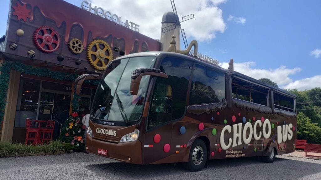À tarde, embarcamos no Chocobus. O passeio passou pelas fábricas da Prawer, da Lugano e da Gramadense, apresentando a história do chocolate artesanal em Gramado.